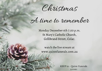 Read MoreThis year Quinn Funerals returns to St Mary’s Church in Colac for its annual “Christmas, a time to remember” event. This event has been held in Colac for over 20 years in conjunction with the Colac Area Health Palliative Care...